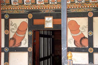 Most visitors to Bhutan comment on the phalluses they find painted on the outer walls of homes all over the country, especially those away from the big cities. These paintings are so explicit they would never make it through the Hollywood censors. The phalluses are always erect. Sometimes they are ejaculating. They are always equipped with testicles, the testicles supplied with hair. But there is nothing pornographic in them, unless it is in the mind of the viewer. These symbols are fertility talismans. They are the “Divine Madman’s” genitals. Think of them as a St. Christopher’s statue on the dashboard of a car. He was the patron saint of travelers. Or as an “evil eye” designed in the Muslim world to ward off evil.